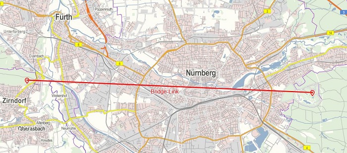 Eine Verbindung über 13 Kilometer, vom „Schmausenbuck-Turm" in Nürnberg zur „Alten Veste" in Zirndorf.